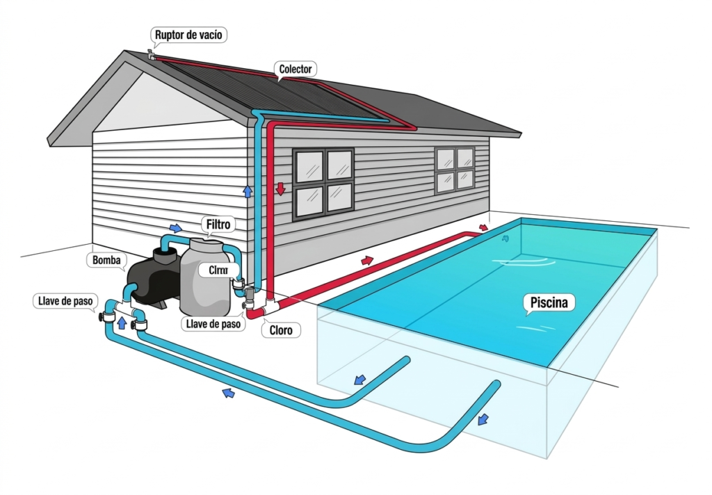 El agua de la piscina es impulsada hacia los colectores mediante la bomba del sistema.